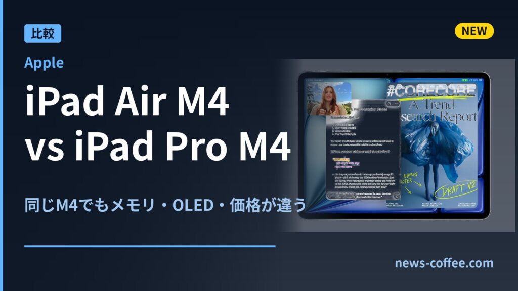 iPad Air M4とiPad Pro M4は同じM4チップを搭載しながら、価格・メモリ・ディスプレイで大きく異なる。Air M4は全モデル12GBのRAMを持ち、Pro M4の256/512GBモデル(8GB)より多い逆転現象も。価格・スペックを徹底比較し、どちらを選ぶべきか解説する。