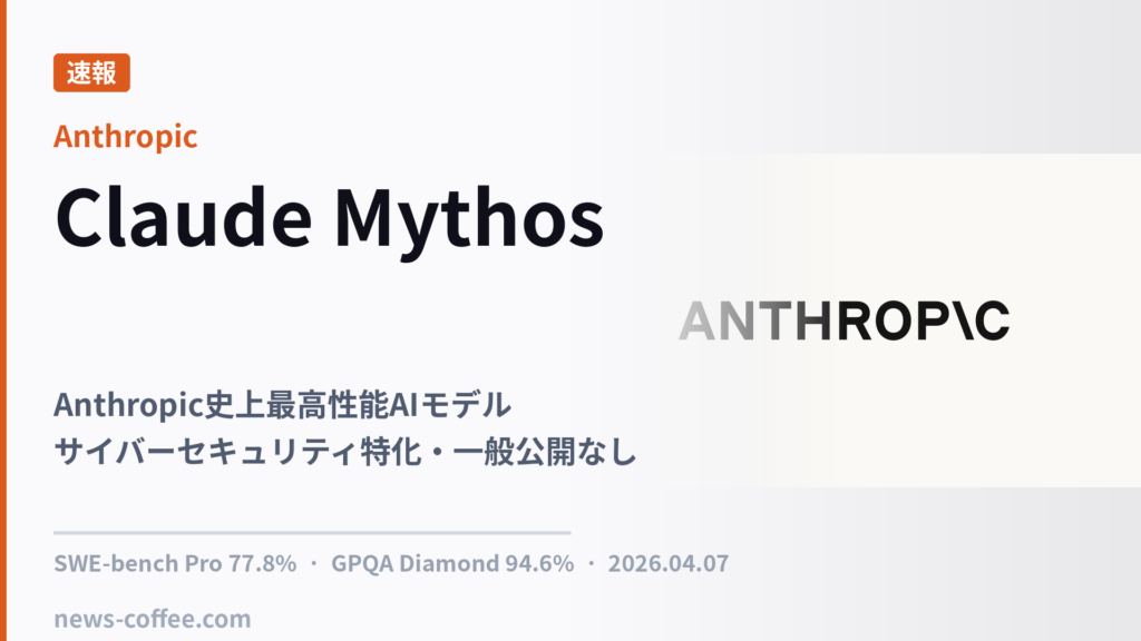 Anthropicが2026年4月7日に発表した最新AIモデル「Claude Mythos」。コーディングベンチマークSWE-bench Pro 77.8%を記録しOpus 4.6を大幅に上回るが、サイバー悪用リスクを理由に一般公開なし。Project Glasswingとは?
