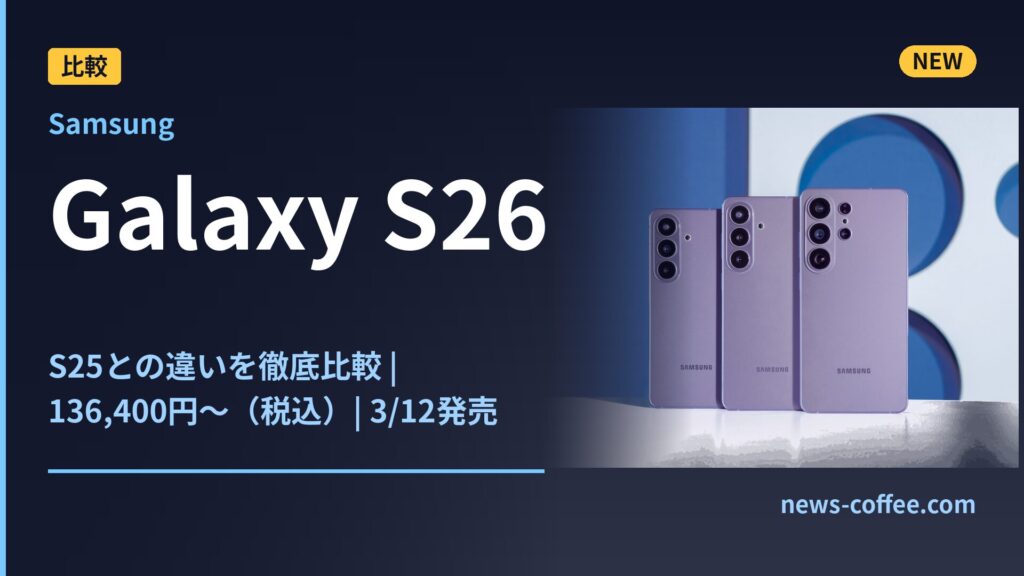 Galaxy S26が2026年3月12日に日本発売。前モデルGalaxy S25との違いはチップ性能・バッテリー・ディスプレイサイズが中心。スペック一覧と価格を比較し、S25ユーザーが買い替えるべきかを解説します。