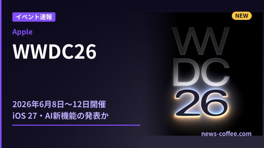 AppleがWWDC26(2026年6月8〜12日)を正式発表。iOS 27・macOS 27など次世代OSとGemini統合によるApple Intelligenceの大幅進化が焦点。メモリ増量トレンドがAI拡張の布石となるか。基調講演は日本時間6月9日午前2時。