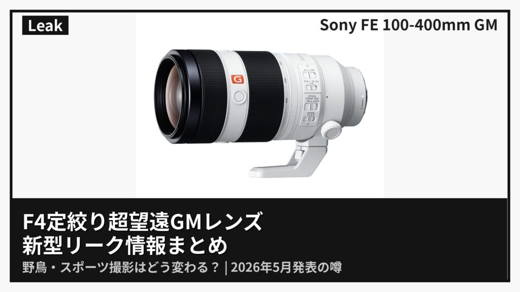 ソニー新型「FE 100-400mm F4 GM」の最新リーク情報まとめ。F4定絞りで野鳥・スポーツ撮影はどう変わる?テレコン活用時の可能性、現行SEL100400GMとの実用差、α7R VIとの高解像シナジーまで徹底解説。2026年5月発表と噂。